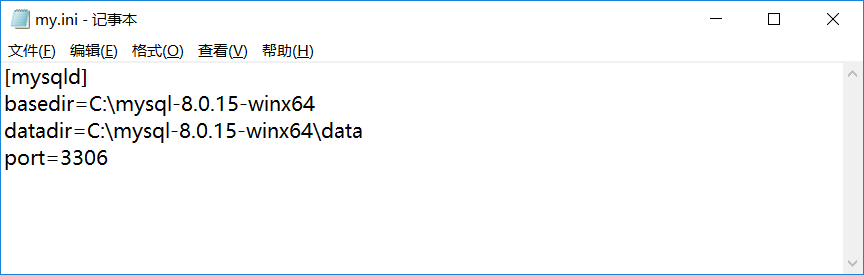 接下来在‘mysql-8.0.15-winx64'目录下新建一个‘.ini'格式的文件,然后在里面输入以下代码并保存: