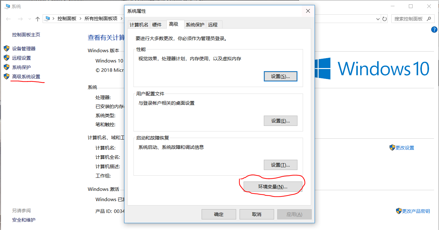 右键‘此电脑'-》‘属性'-》‘高级系统设置'-》‘环境变量'