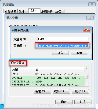 在系统环境变量–PATH,添加D:\Program Files\mysql-8.0.13-winx64/bin;(解压路径对应的bin目录,以英文分号结尾)