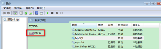 1、通过命令启动MySQL服务 net start mysql。通过命令net stop mysql停止服务。通过命令sc delete MySQL/mysqld -remove卸载 MySQL 服务