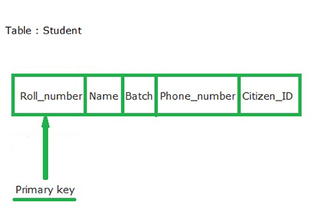 为了更好地理解主键,我们创建一个名为Student的表,它具有roll_number、name、batch、phone_number、citizen_id等属性。