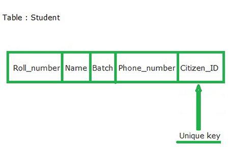 为了更好地理解唯一键,我们使用带有Roll_number,Name,Batch,Phone_number和Citizen_ID属性的Student表;其中Roll_number属性已经给主键。