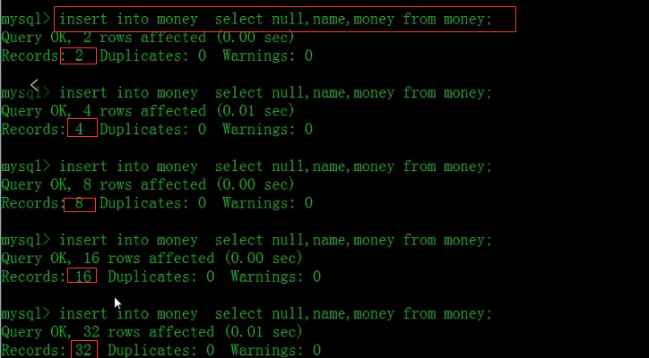 这里我们就可以看到,数据以2,4,8,16,32...的规律来增长的,也就是我们熟悉的以指数形式增加的。那么一直操作下去,就能在短时间内使得表中数据膨胀到一定数量级,从而达到测试出表压力的目的。