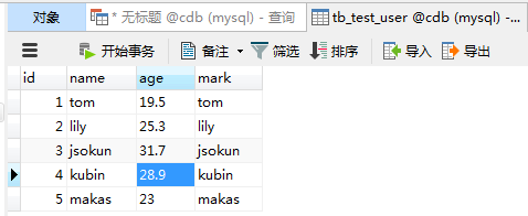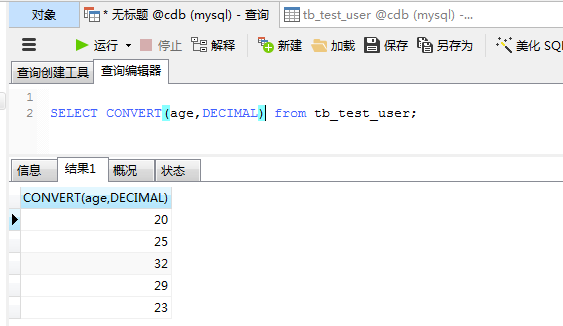 5、在接着看看CONVERT()函数,这个函数主要是服务于要求精度的需求,这里改改原始的数据,把age列改为带小数的用于测试一下这个函数。