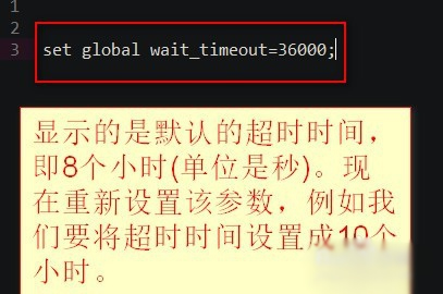 4.显示的是默认的超时时间,即8个小时(单位是秒)。现在重新设置该参数,例如我们要将超时时间设置成10个小时。