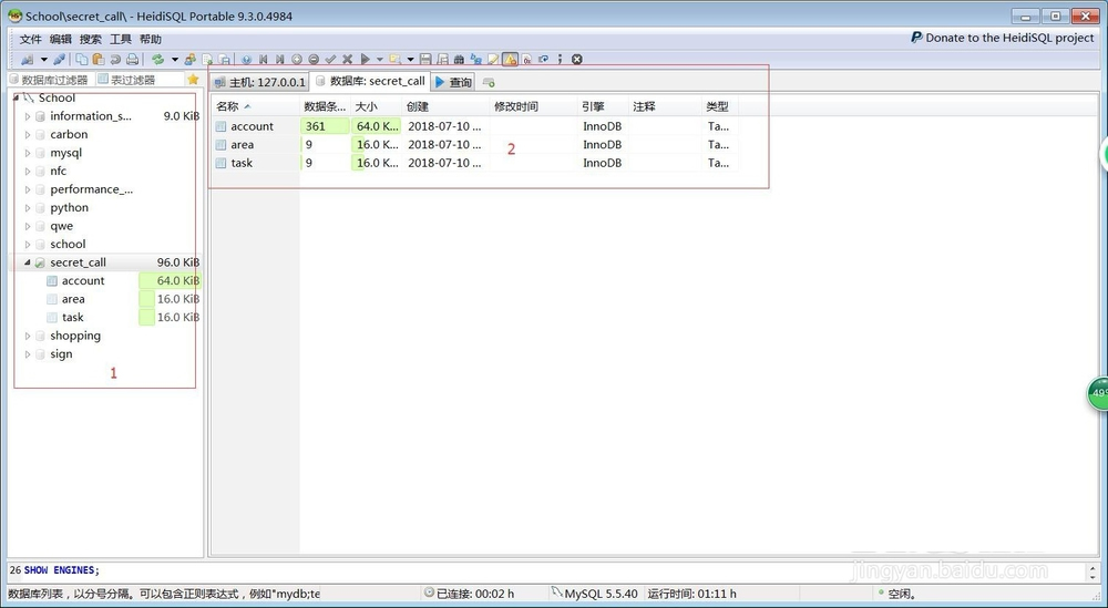 进入如图所示的管理界面,左边1处可选择数据库,右上2处自动展示所选数据库的数据信息