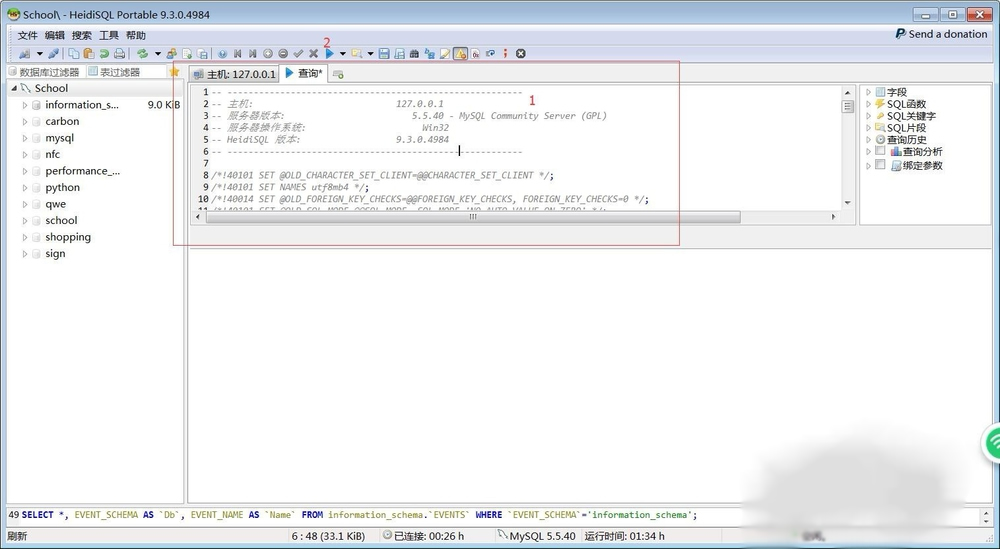 2 打开heidisql,在图中1处粘贴刚刚复制的数据,点击图中2处的运行按钮,可能会产生警告,点击确定即可,然后按F5刷新列表,可以看到,数据库已经成功创建,并且数据也已经完成插入