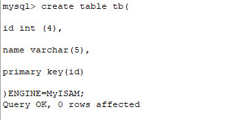 create table tb( id int (4), name varchar(5), primary key(id) )ENGINE=MyISAM;