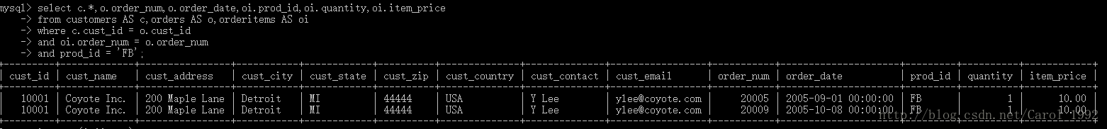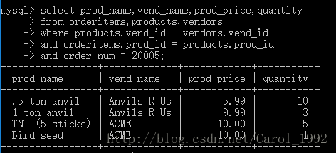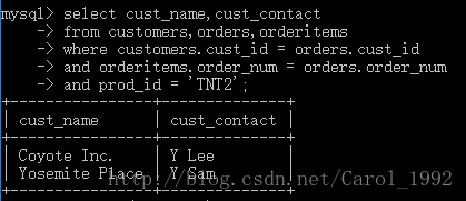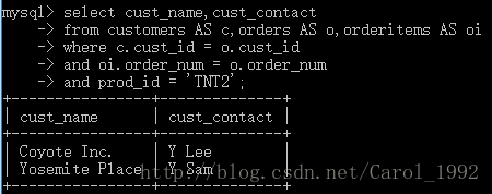 在一条SELECT语句中联结几个表时,相应的关系是在运行中构造的,在数据库表的定义中不存在能指示MySQL如何对表进行联结的东西。在联结两个表时,实际上是将第一个表中的每一行与第二个表中的每一行配对。WHERE子句作为过滤条件,它只包含那些匹配给定条件(这里是联结条件)的行。没有WHERE子句,第一个表中的每个行将与第二个表中的每个行配对,而不管它们逻辑上是否可以配在一起。