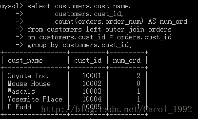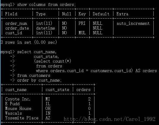 实例:显示customers 表中每个客户的订单总数