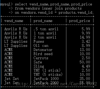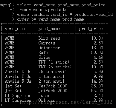联结:联结是一种机制,用来在一条SELECT语句中关联表,可以联结多个表返回一组输出。