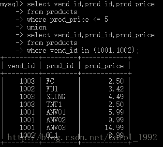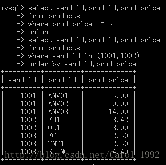 UNION指示MySQL执行两条SELECT语句,并把输出组合成单个查询结果集。该解法与where prod_price<=5 OR vend_id in(1001,1002);等效