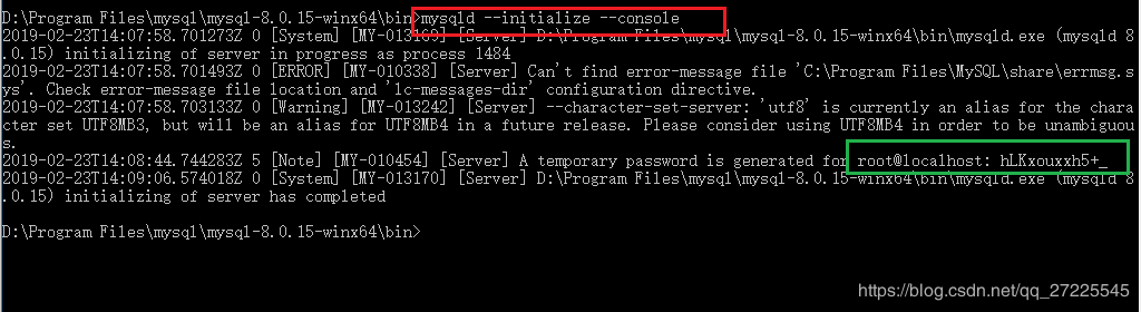 4.mysql初始化:执行:mysqld --initialize --console 图中红色框的内容, 并记下临时密码(绿色框中):不计首个空格;