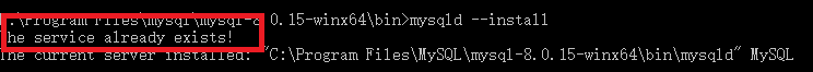 5.mysql安装服务:重新进入cmd,执行:mysqld --install ,若出现如下情况,则执行 sc delete mysql 再执行 mysqld --install