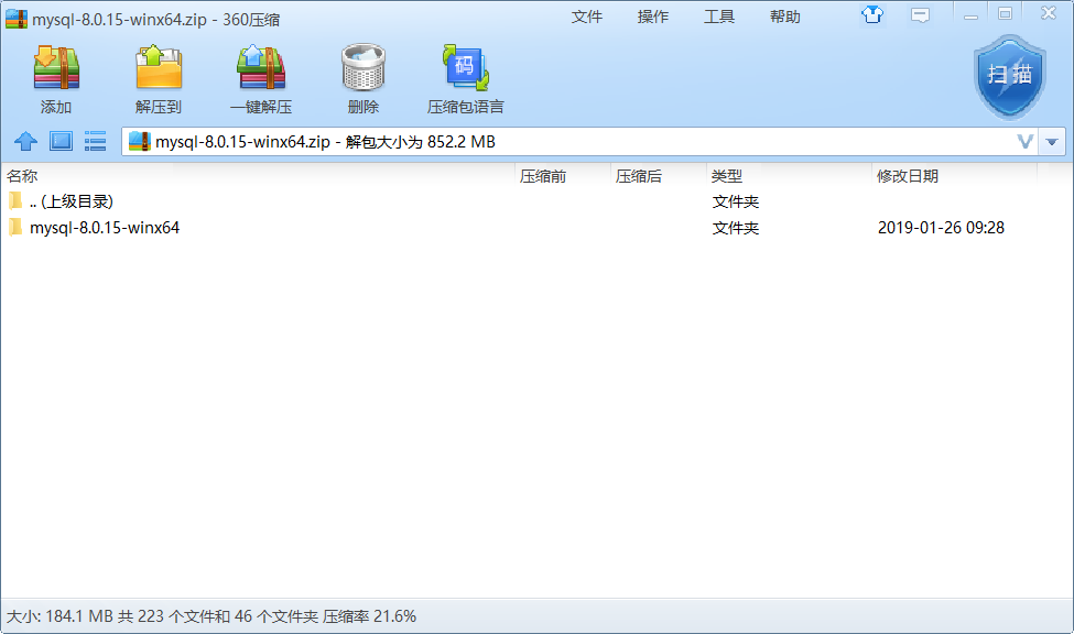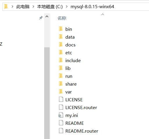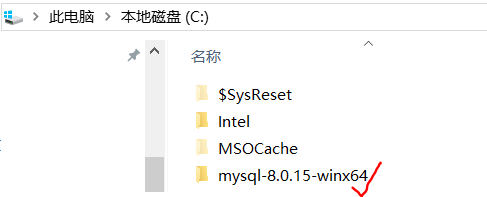 这里下载完成的是一个压缩文件,直接将里面的‘mysql-8.0.15-winx64'文件夹解压到你想要安装的路径即可,我是直接安装在C盘的。