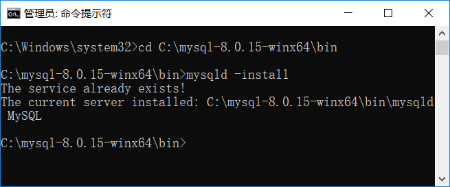 然后输入mysqld -install 等待安装服务。注意中间有一个空格。