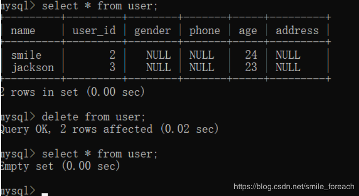 如果没有指定条件,会将表中数据一条一条全部删除掉。