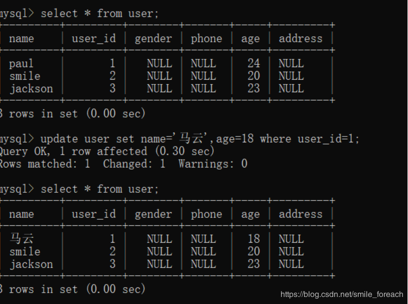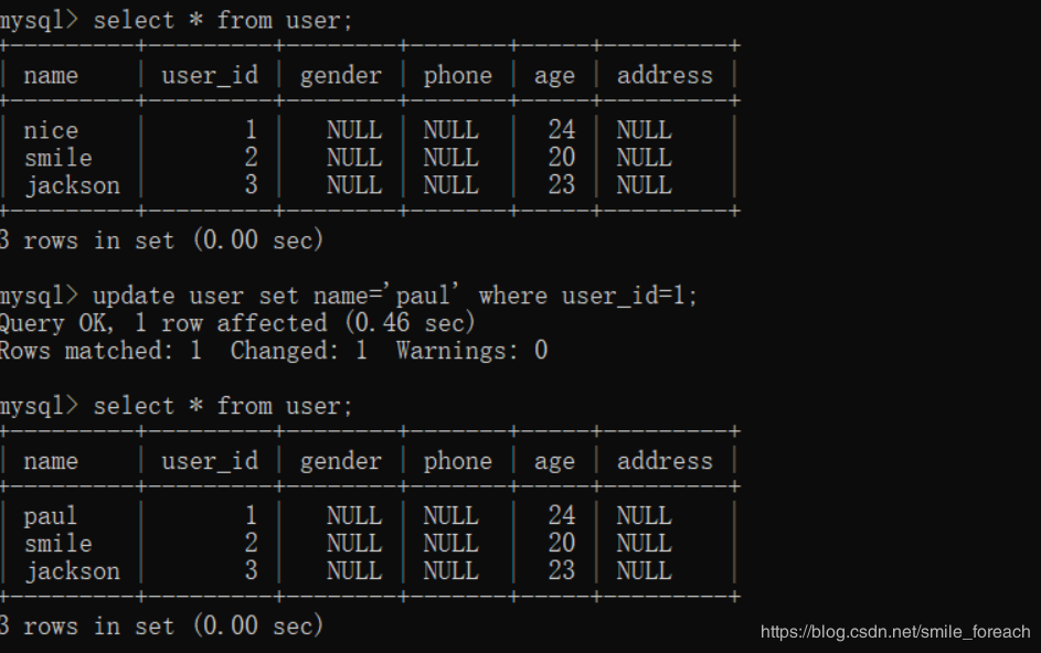 insert into user(user_id,name,age) values(1,'nice',24);