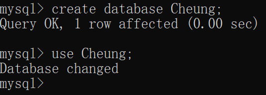 输入create database Cheung,然后使用自己创建的数据库,输入use Cheung;