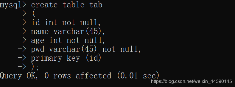要注意,我这里没有提前设置id的值能够自增,即没有在创建表时候写上: