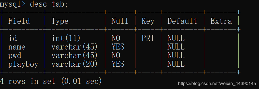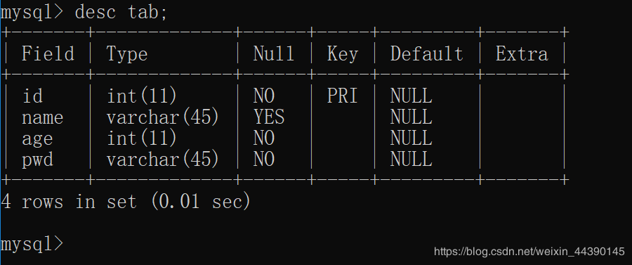 这样就表示要使用的表tab已经创建完毕了,我们可以通过输入:desc tab