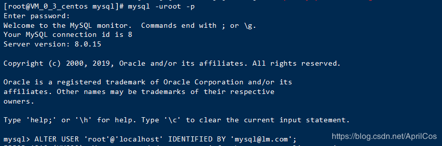 修改密码的命令ALTER USER 'root'@'localhost' IDENTIFIED BY 'mysql@lm.com';