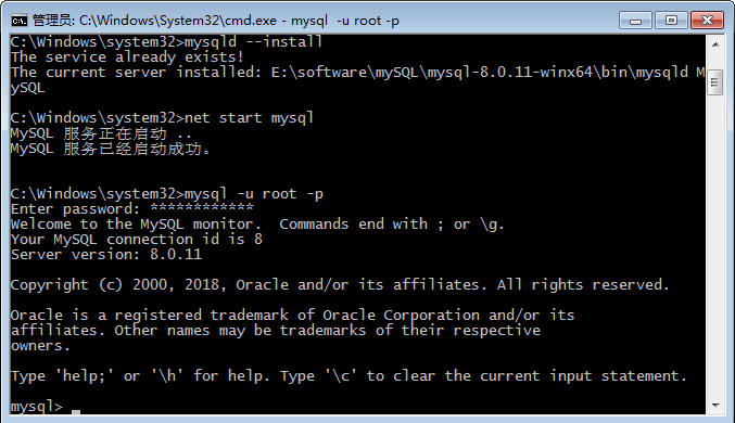C:\Users\Administrator>cd C:\Program Files\MySQL\bin C:\Program Files\MySQL\bin>mysqld --initialize --console 2018-04-28T15:57:17.087519Z 0 [System] [MY-013169] [Server] C:\Program Files\MySQL\bin\mysqld.exe (mysqld 8.0.11) initializing of server in progress as process 4984 2018-04-28T15:57:24.859249Z 5 [Note] [MY-010454] [Server] A temporary password is generated for root@localhost: rI5rvf5x5G,E 2018-04-28T15:57:27.106660Z 0 [System] [MY-013170] [Server] C:\Program Files\MySQL\bin\mysqld.exe (mysqld 8.0.11) initializing of server has completed C:\Program Files\MySQL\bin>