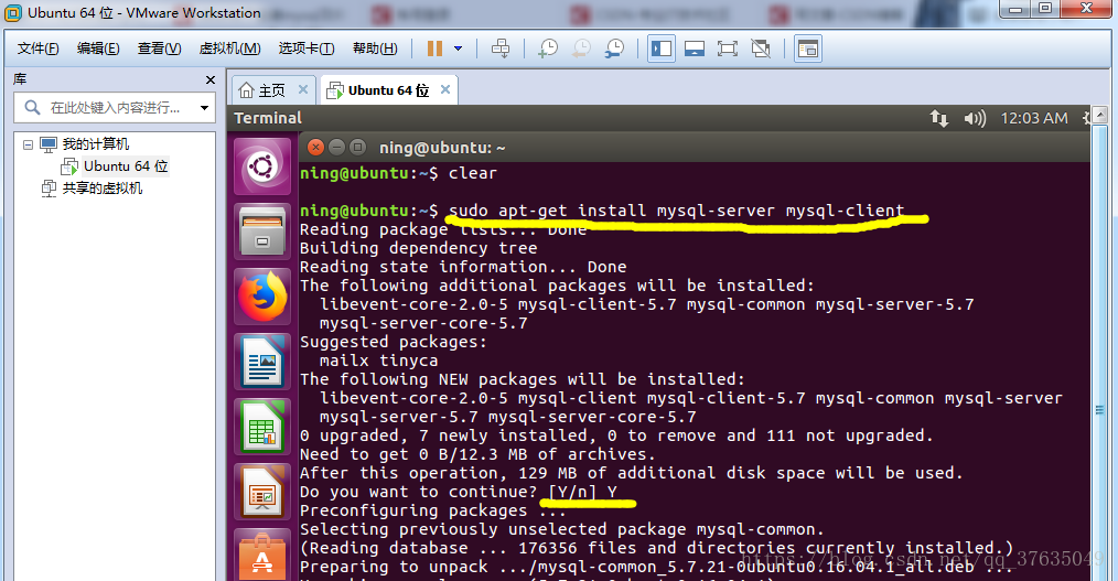 在虚拟机中Ctrl+Alt+T打开一个终端,输入命令 sudo apt-get install mysql-server mysql-client ,然后按照提示输入。
