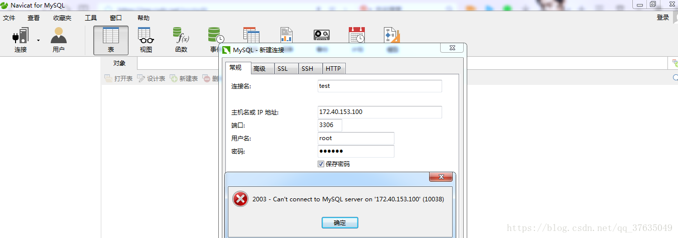 然而此时的数据库还不能使用Navicat for MySQL连接,会报错,错误提示如下图(因为还没配置文件远程连接):