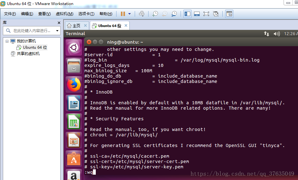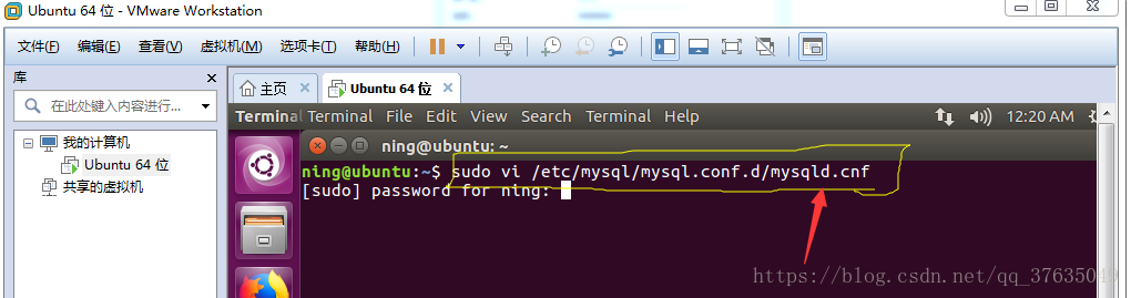 在终端输入命令:sudo vi /etc/mysql/mysql.conf.d/mysqld.cnf