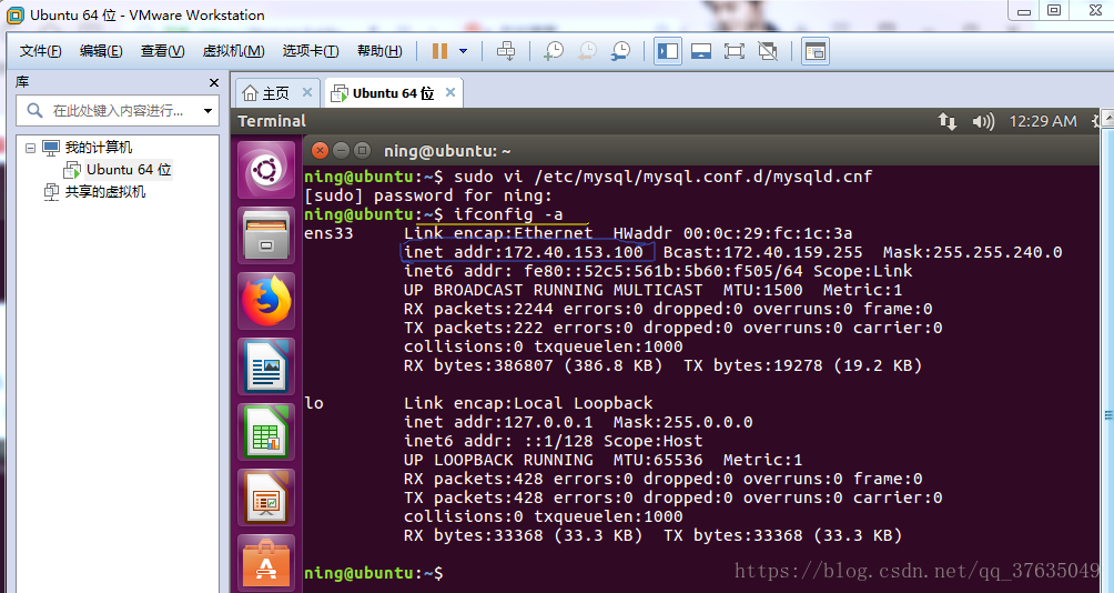 首先确定虚拟机IP,在终端输入命令: ifconfig -a 即可,其中inet addr才是真正的ip,在navicat for MySQL中需要输入的IP