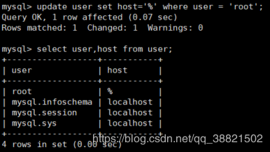 3)update user set host='%' where user = ‘root';