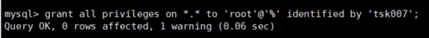 4)grant all privileges on . to ‘root'@'%' identified by ‘tsk007' with grant option;