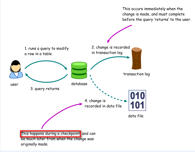 在SQL Server中,进行insert, update, delete时,数据并没有直接写入数据库对应的mdf文件中,而是写入了缓存里,这时,就要提到一个非常重要机制:CheckPoint,它主要作用是把缓存中的数据写入mdf文件中。