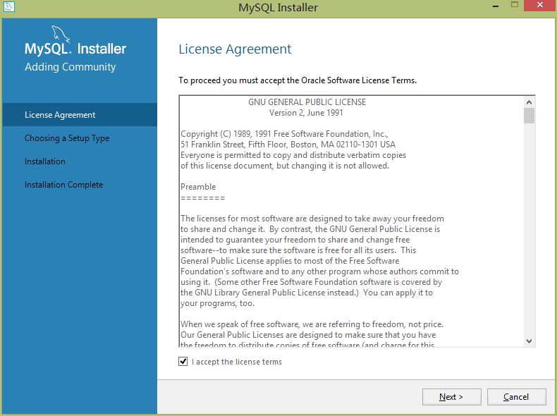 1、打开下载好的mysql-installer-community-8.0.16.0.msi文件,选择同意进入下一步