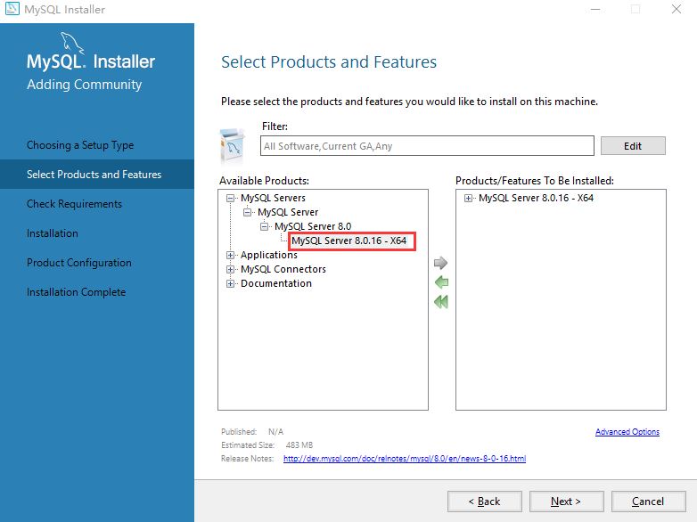 3、选择左侧的MySQL Server 8.0.16 - x64 到右侧 下一步
