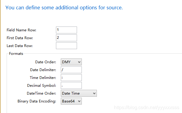 5、根据你的csv文件内容来调整,field name row字段名所在的行数,first data row为第一条数据所在的行数。last data row可以不写出,后面时间格式我直接默认,因为我的文件没有时间数据