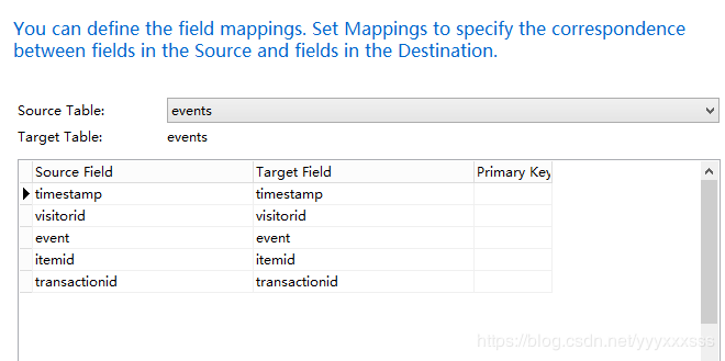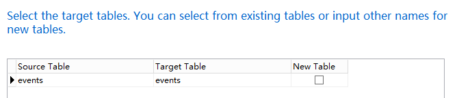 6、选择数据要导入的表,如果不存在会创建同名的表。例如我已经创建了events表,则下面new table就会为空框
