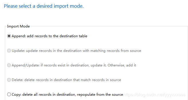 8、选择将数据直接添加到目标表中,如果表中有数据,可以选择copy:清空所有数据然后导入。