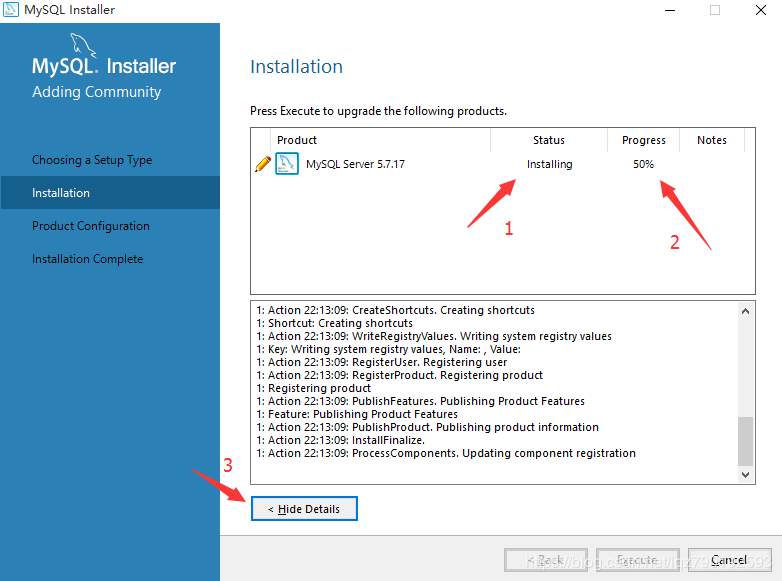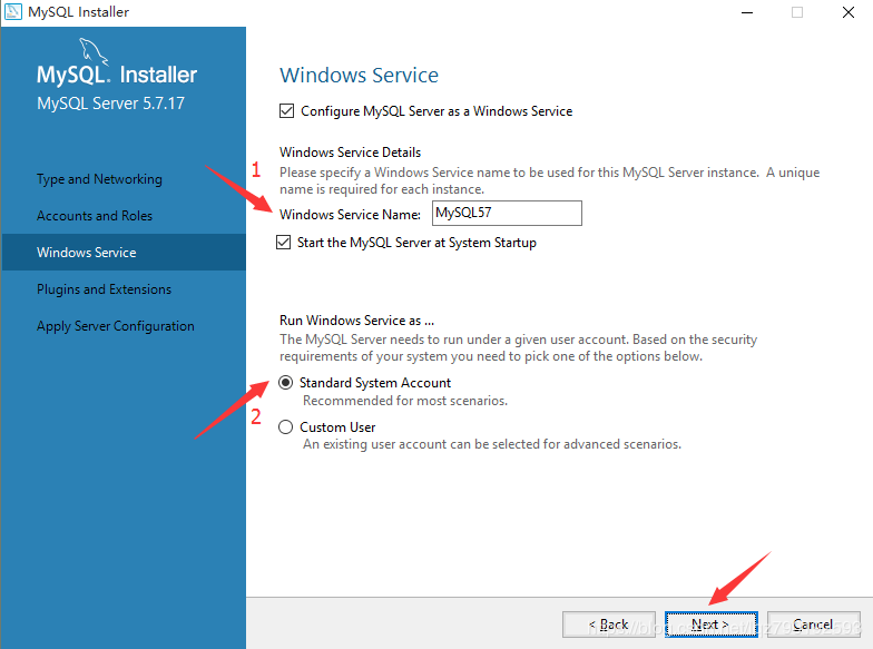 标注1:由于咱们使用的是mysql-5.7.17版本,因此默认的服务器名称为MySQL57;标注2:默认选择Standard System Account即可。