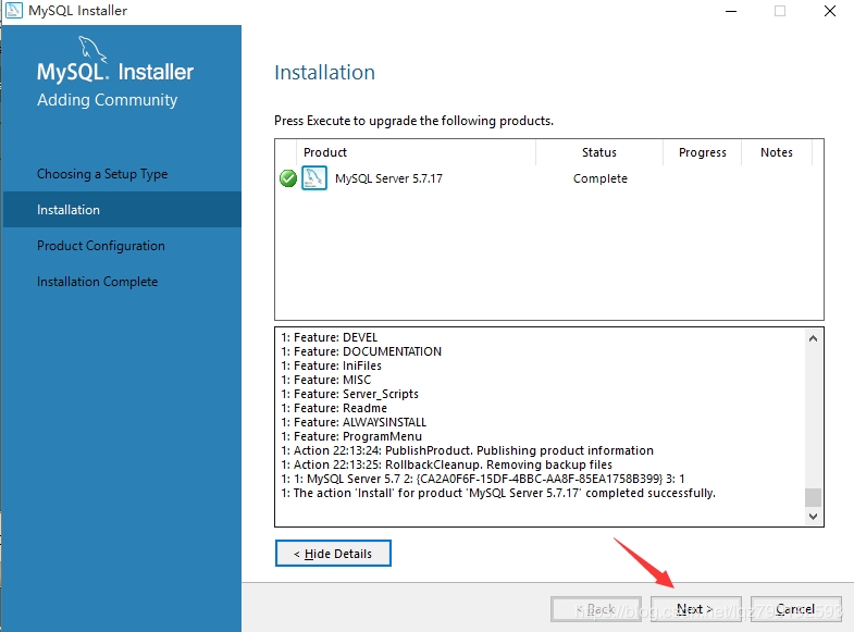 如上图所示,此为 MySQL 数据库升级成功的标志,点击Next: