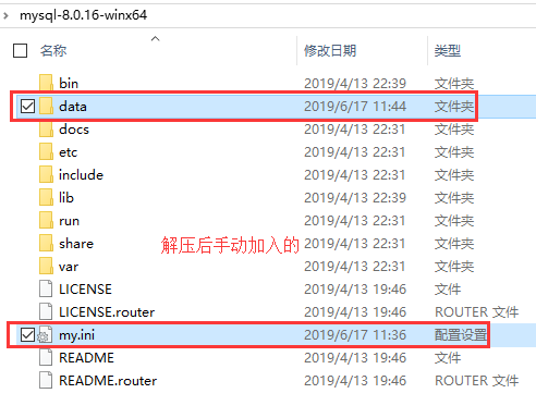 其中dada文件夹和my.ini配置文件是解压后手动加入的,如下图所示