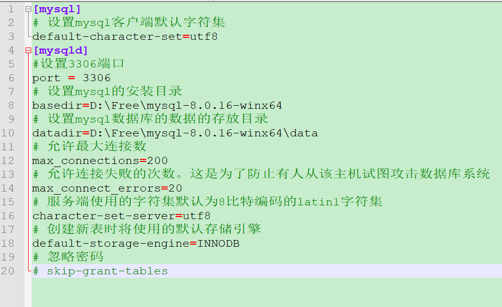 [mysql] # 设置mysql客户端默认字符集 default-character-set=utf8 [mysqld] #设置3306端口 port = 3306 # 设置mysql的安装目录 basedir=D:\Free\mysql-8.0.16-winx64 # 设置mysql数据库的数据的存放目录 datadir=D:\Free\mysql-8.0.16-winx64\data # 允许最大连接数 max_connections=200 # 允许连接失败的次数。这是为了防止有人从该主机试图攻击数据库系统 max_connect_errors=20 # 服务端使用的字符集默认为8比特编码的latin1字符集 character-set-server=utf8 # 创建新表时将使用的默认存储引擎 default-storage-engine=INNODB # 忽略密码 # skip-grant-tables