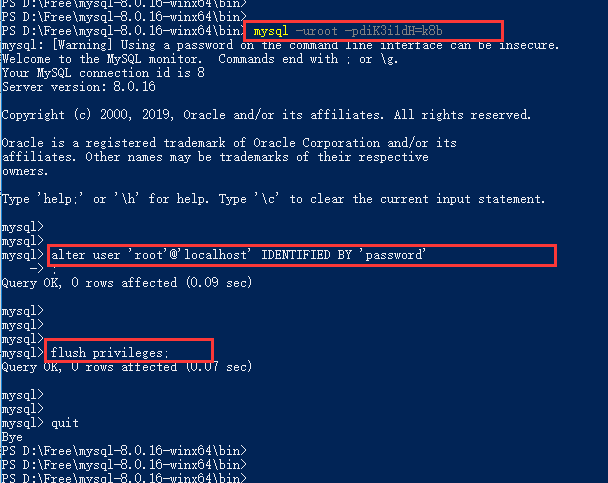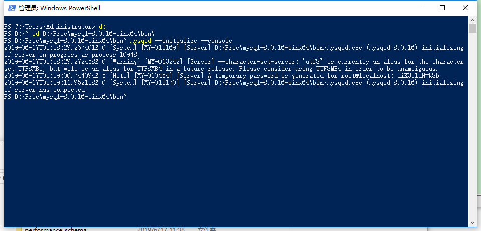 管理员身份打开Windows PowerShell,并进入D:\Free\mysql-8.0.16-winx64\bin目录,执行如下命令: