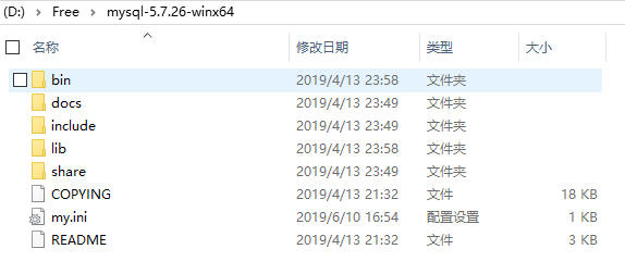 2、新建配置文件my.ini放在D:\Free\mysql-5.7.26-winx64目录下