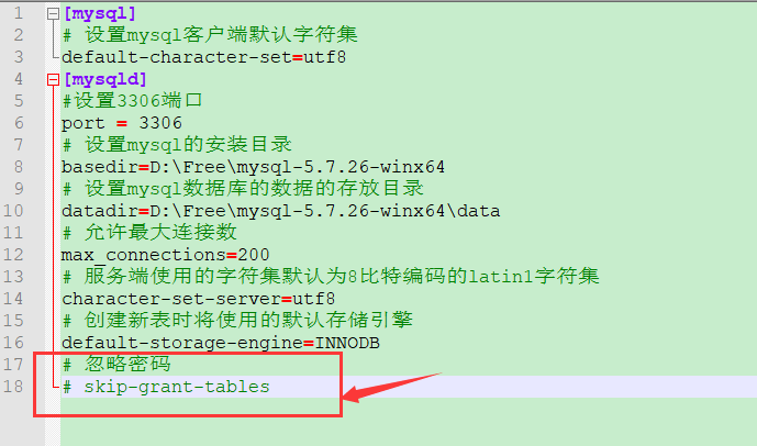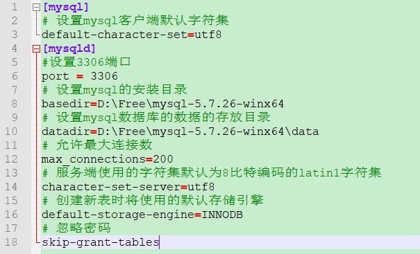 [mysql] # 设置mysql客户端默认字符集 default-character-set=utf8 [mysqld] #设置3306端口 port = 3306 # 设置mysql的安装目录 basedir=D:\Free\mysql-5.7.26-winx64 # 设置mysql数据库的数据的存放目录 datadir=D:\Free\mysql-5.7.26-winx64\data # 允许最大连接数 max_connections=200 # 服务端使用的字符集默认为8比特编码的latin1字符集 character-set-server=utf8 # 创建新表时将使用的默认存储引擎 default-storage-engine=INNODB # 忽略密码 skip-grant-tables