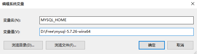 MYSQL_HOME=D:\Free\mysql-5.7.26-winx64 PATH后加入%MYSQL_HOME%\bin;