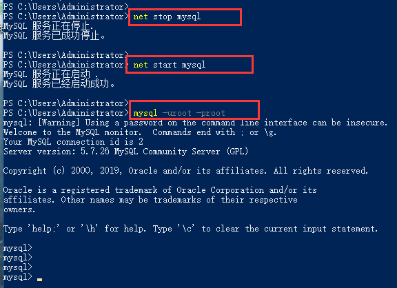 9、重新启动MySQL并重新用新密码登录登录