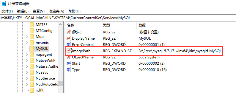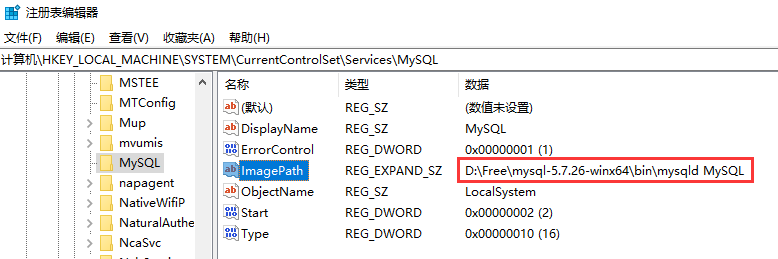 修改windows注册表中MySQL的ImagePath路径为Mysql的实际安装路径,如下图所示