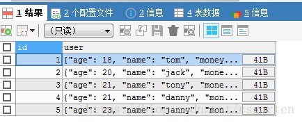 INSERT INTO test (id,USER) VALUES(1,'{"name": "tom", "age": 18, "money": 3000}');